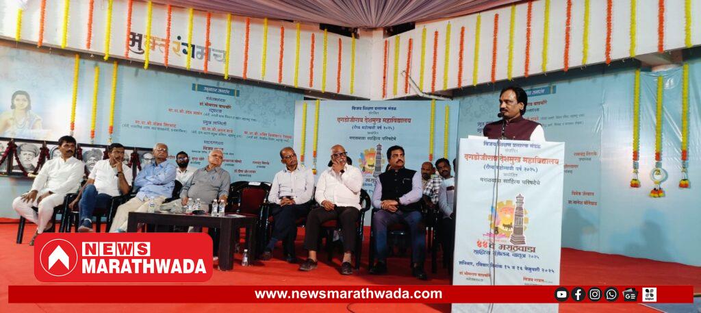 बजाज नगरातील विजय शिक्षण प्रसारक मंडळ संचलित दगडोजीराव देशमुख महाविद्यालयाच्या रौप्य महोत्सवानिमित्त आयोजित ४४व्या मराठवाडा साहित्य संमेलनाचा समारोप रविवार १६ रोजी थाटात करण्यात आला. यावेळी समारोप कार्यक्रमाला विरोधी पक्षनेते अंबादास दानवे, संमेलन स्वागतध्यक्ष विजय कुमार राऊत, प्रा. हजारे, मनीष जैस्वाल, मसापचे डॉ. दादा गोरे, गणेश मोहिते, स सो खंडाळकर आदी मान्यवरांची विशेष उपस्थिती होती. समारोपदिनी मुलाखत, विशेष संवाद, परिसंवाद आदी साहित्यप्रकारांसह बाल साहित्यिकांचा बालकुमार मेळावा आदी कार्यक्रम सादर झाले. समाज साहित्य चित्रपट व मालिका यावर विशेष परिसंवादात अभिनेत्री चिन्मयी सुमित, गीतांजली कुलकर्णी, गणेश चंदनशिवे आणि सूत्रधार प्रेषित रुद्रवार यांनी सहभाग घेतला. तर शाहू पाटोळे यांची मुलाखत झाली. यावेळी साहित्य रसिक मोठ्या संख्येने उपस्थित होते. यावेळी आ. दानवे बोलत होते.
